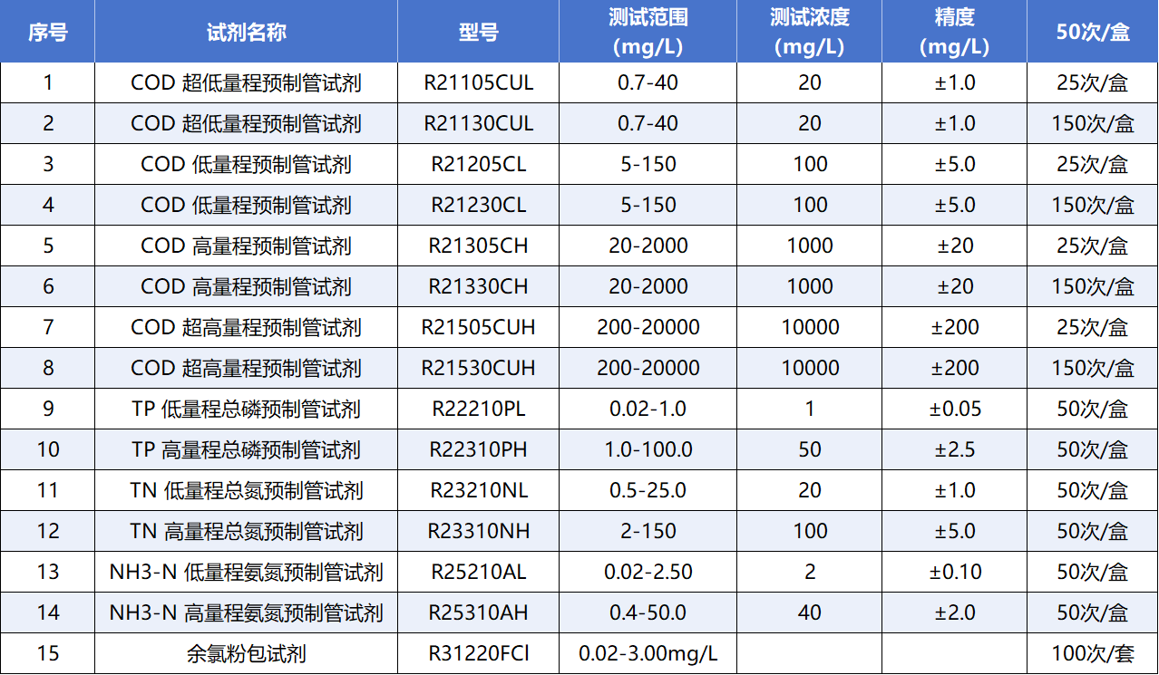 洛联的预制管试剂产品适用于污水、地表水和其他环保领域对水样中COD、TP(总磷)、TN(总氮))、NH3-N(氨氮)含量的测定。